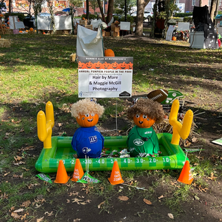 Pumpkin People in the Park is sponsored by Calhoun Mania Funeral Home and Compass Wealth Management. The hay bales were donated by BCB Bank.